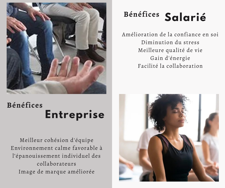 La sophrologie en entreprise est une méthode préventive. Dans sa pratique régulière, elle améliore la concentration et la créativité, diminue les effets du stress, la violence au travail, ou le harcèlement. C’est un bon outil pour éviter les risques psycho-sociaux.