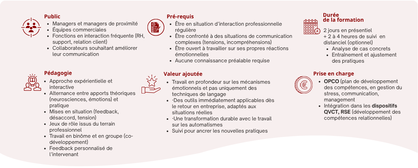 En travaillant à la fois sur les mécanismes internes et les pratiques de communication, cette formation offre des outils concrets pour transformer durablement les dynamiques relationnelles en entreprise.
